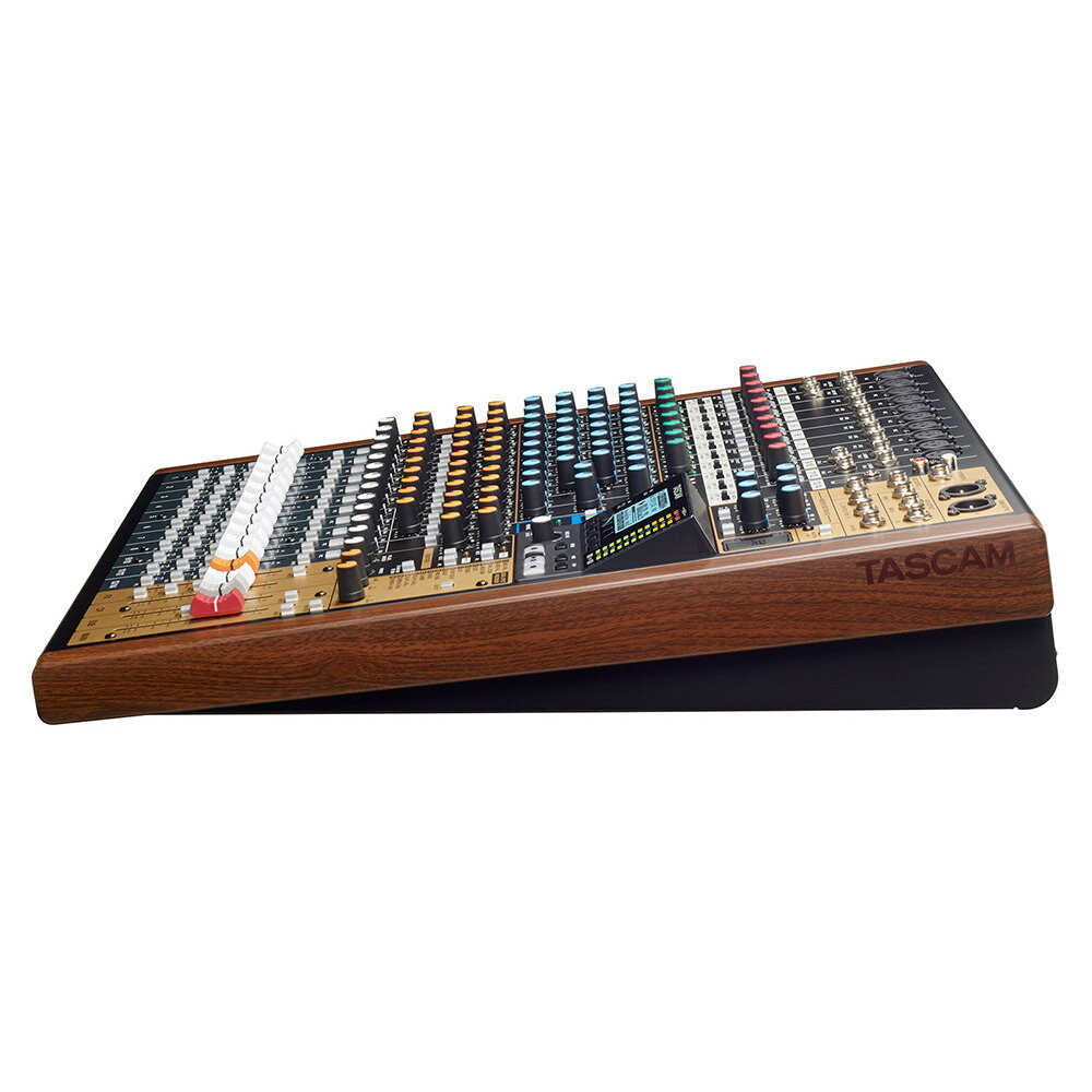 SDカード(Class 10以上)に最大48kHz/24bit、16マルチトラック同時レコーディングが可能・最大8トラックのパンチイン・パンチアウトが可能・16入力/14出力USBオーディオインターフェース機能でDAWとのオーディオデータの入出力が可能・14ch ミキサー入力(10 モノラルXLR/TRS-バランス、2TRS-バランス ステレオペア)・10ch マイクプリアンプ、CH1〜CH8にはクリアな音色のTASCAM Ultra-HDDAマイクプリアンプを装備・オーバーロード(OL)付シグナルLED搭載ゲイン調整ノブ(CH1〜CH12)を装備・各チャンネルの入力ソース切り替えに(LIVE/PC/MTR)モードスイッチを装備・便利な1ノブコンプレッサーをモノ入力チャンネル(CH1〜CH8)に装備・入力には3バンドEQ装備 、CH1〜CH8にはミッドパラメトリックEQ(中域周波数可変型)装備・100Hz ローカットフィルター (CH1〜CH12)・全てのXLRマイク入力には+48Vファントムパワー対応・3つのAUX系出力、 AUX1(pre)、AUX2(pre/post切替付き)、FX(post)・各入力セクションにミュート、MAIN/SUBバスアサイン、PFLスイッチを装備・AAC、SBCコーデック対応のブルートゥース(Bluetooth 5.0)入力・CH13/14ライン入力にはRCAピンと3.5mmステレオミニジャックを装備・Hi/LoシェルビングEQ、WIDEとNARROR QのパラメトリックEQ装備(マスター出力 MAIN/SUB切替)・実用的なリバーブ/ディレイなど16プリセットTASCAM内蔵エフェクター・XLRバランスのMAIN出力とTRSバランスのSUB出力・視認性の高い12セグメントLED出力レベルメーター・1系統のステレオコントロールルーム出力・6.3mm(1/4")ステレオ標準ジャックヘッドフォン出力・フットスイッチ用リモートコントロールジャック(6.3mm(1/4")TS標準ジャックTASCAM RC-1F用)・視認性に優れた自照式REC/PLAY操作キー・使いやすさを配慮した操作メニュー構成・簡単なメニュー操作を可能にするマルチジョグダイヤルを搭載・19インチ ラックマウント対応(ラックマウントキットは別売オプション)・落ち着いた木目調の側面ウッドパネル(ラックマウント時には取り外し)【詳細情報】レコーダー部 対応メディア SD (512MB〜2GB)、SDHC (4GB〜32GB)、SDXC (64GB〜512GB)※Class 10以上ファイルシステム SD card:FAT16、SDHC card:FAT32、SDXC card:exFAT録音フォーマット WAV (BWF)再生フォーマット WAV、BWFサンプリング周波数 44.1k / 48k Hzビット長 16 / 24 bit録音可能チャンネル数 最大16チャンネル (14チャンネル + 2ステレオミックス)オーディオ入力 MIC IN CH1〜8、9/10、11/12端子 XLR 3-31 (1:GND、2:HOT、3:COLD、バランス)最大入力レベル +10dBu規定入力レベル -8dBu最小入力レベル -58dBuゲイン調整範囲 0〜50dB入力インピーダンス 1.8kΩファントム電源 +48VLINE IN CH1〜8、9/10、11/12端子 6.3mm(1/4") TRS標準ジャック (T:HOT、R:COLD、S:GND、バランス)最大入力レベル +22dBu規定入力レベル +4dBuゲイン調整範囲 -10〜+40 dB:CH 1〜8、+20〜+30 dB:CH 9/10 and 11/12入力インピーダンス 22kΩINST IN CH 1、2端子 6.3mm(1/4") TRS標準ジャック (T:HOT、R:GND、S:GND、アンバランス)最大入力レベル +22dBu規定入力レベル +4dBuゲイン調整範囲 -10〜+40 dB入力インピーダンス 1MΩINSERT CH 1、2端子 6.3mm(1/4") TRS標準ジャック (T:Send、R:Return、S:GND)Return (Ring) 最大入力レベル +18dBu規定入力レベル 0dBu入力インピーダンス 10kΩSend (Tip) 最大出力レベル +18dBu規定出力レベル 0dBu出力インピーダンス 100ΩRCA INPUT 端子 RCAピンジャック (アンバランス)最大入力レベル +8dBV規定入力レベル -10dBV入力インピーダンス 10kΩSTEREO INPUT 端子 3.5mm(1/8") ステレオミニジャック (アンバランス)最大入力レベル +8dBV規定入力レベル -10dBV入力インピーダンス 10kΩOutouts MAIN OUTPUT 端子 XLR 3-32 (1:GND、2:HOT、3:COLD、バランス)最大出力レベル +22dBu 規定出力レベル +4dBu出力インピーダンス 100ΩSUB OUT、MONITOR、FX OUT、CONTROL ROOM OUT 端子 6.3mm(1/4") TRS標準ジャック (T:HOT、R:COLD、S:GND、バランス)最大出力レベル +16dBu 規定出力レベル -2dBu出力インピーダンス 100ΩPHONES OUT 端子 6.3mm(1/4") 標準ジャック出力レベル 80mW + 80mW (32Ω負荷時)REMOTE TASCAM RC-1F対応端子 6.3mm(1/4") TS標準ジャックUSB Audio 端子 USB Bタイプ 4ピンフォーマット USB2.0 High-Speed、マスストレージクラス / USBオーディオクラスサンプリング周波数 44.1k/48k Hzビット長 16/24 bit最大入力数 16チャンネル最大出力数 14チャンネルBluetooth バージョン 5.0出力クラス Class 2見通し通信距離 約10m※通信距離は目安です。