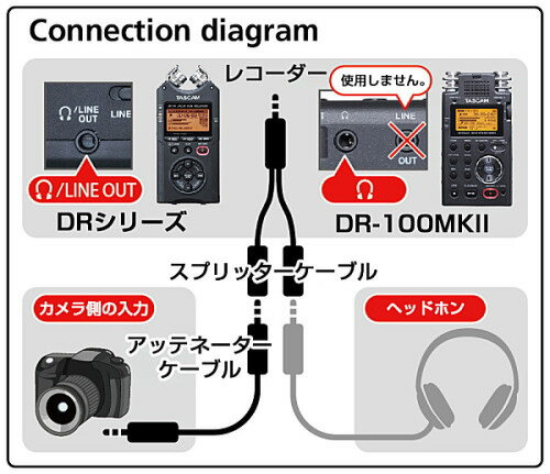 ■最適なレベルでカメラに音声を入力できるアッテネーターケーブル ■カメラへの音声出力と音声モニタリングを両立するスプリッターケーブル ・ハンディレコーダーの音声出力端子はヘッドホン出力端子となっているため、デジタル一眼レフ等カメラの音声入力端子に直接接続した場合、音質が劣化してしまいます。