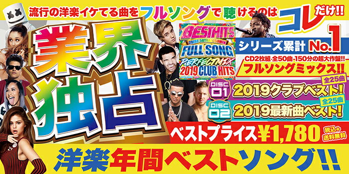 入荷日 2019年6月30日 ジャンル ALL GENRE フォーマット CD2枚組 全50曲 レーベル NO DISCRIPTION 品番 MKDR-0060REVIEW商品レビュー フルソングで聴けるのはコレだけ!シリーズ最新作!! フルソング・ノンストップミックス!!業界独占!!NO.1セールス記録中!! 流行の洋楽イケてる曲をフルソングで聴けるのはコレだけ!! 洋楽年間ベストソング!!超最速リリース!! ベストプライス\1,980+tax CD2枚組 全50曲 150分の超大作盤!! 2019年最重要クラブヒッツ&話題曲フルソングMIX!! ベストヒッツフルソングシリーズ最新作リリース!! DISC1 : 2019年クラブヒッツベスト!全25曲 DISC2 : 最新洋楽クラブベストヒッツベスト! 全25曲 シリーズ累計NO.1!!売れてます!!売れすぎ!! TRACK LIST収録楽曲一覧 DISC1 : 2019 CLUB HITS BEST SIDE 01. Without Me - cv. Halsey 02. 7 rings - cv. Ariana Grande 03. God Is a Woman - cv. Ariana Grande 04. That's What I Like - cv. Bruno Mars 05. Wolves - cv. Selena Gomez & Marshmello 06. Girls Like You - cv. Maroon 5 ft. Cardi B 07. Better Now - cv. Post Malone 08. God’s Plan - cv. Drake 09. Rockstar - cv. Post Malone ft. Savage 21 10. I'm The One - cv. DJ Khaled f.t Justin Bieber, Quavo, Chance The Rapper & Lil Wayne 11. Sunflower (Spider-Man Into The Spider-Verse) - cv. Post Malone, Swae Lee 12. Empire State Of Mind - cv. Jay-Z ft. Alicia Keys 13. Despacito - cv. Luis Fonsi & Daddy Yankee 14. Shape Of You - cv. Ed Sheeran 15. Taki Taki - cv. DJ Snake feat. Selena Gomez 16. Lean On - cv. Major Lazor & DJ Snake ft. MO 17. Dura - cv. Daddy Yankee 18. Mi Gente - cv. J Balvin ft. Willy William 19. La Modelo - cv. Ozuna ft. Cardi B 20. MIA - cv. Bad Bunny ft. Drake 21. In My Feelings - cv. Drake 22. Nice for What - cv. Drake 23. All The Stars - cv. Kendrick Lamar ft. SZA 24. Shallow - cv. Lady Gaga & Bradley Cooper 25. Perfect - cv. Ed Sheeran DISC2 : NEW CLUB HITS BEST SIDE 01. Giant - cv. Calvin Harris, Rag'n'Bone Man 02. Promises - cv. Calvin Harris & Sam Smith 03. One Kiss - cv. Calvin Harris, Dua Lipa 04. No Money - cv. Galantis 05. What Do You Mean - cv. Justin Bieber 06. No Tears Left to Cry - cv. Ariana Grande 07. thank u, next - cv. Ariana Grande 08. Dancing With A Stranger - cv. Sam Smith, Normani 09. The Middle - cv. Zedd ft. Maren Morris & Grey 10. Finesse (Remix) - cv. Bruno Mars ft. Cardi B 11. One Dance - cv. Drake ft. Wizkid & Kyla 12. Unforgettable - cv. French Montana ft. Swae Lee 13. Sorry - cv. Justin Bieber 14. Rockabye - cv. Clean Bandit ft. Sean Paul & Anne Marie 15. Bebe - cv. 6ix9ine ft. Anuel Aa 16. The Greatest - cv. Sia ft. Kendrick Lamar 17. Closer - cv. Chainsmokers 18. Happier - cv. Marshmello & Bastille 19. Rise - cv. Jonas Blue 20. Stay - cv. Zedd & Alessia Cara 21. 24k Magic - cv. Bruno Mars 22. Post Malone - "Wow." 23. Freaky Friday - cv. Lil Dicky ft. Chris Brown 24. Wild Thoughts - cv. DJ Khaled ft. Rihanna & Bryson Tiller 25. Swalla - cv. Jason Derulo ft. Nicki Minaj